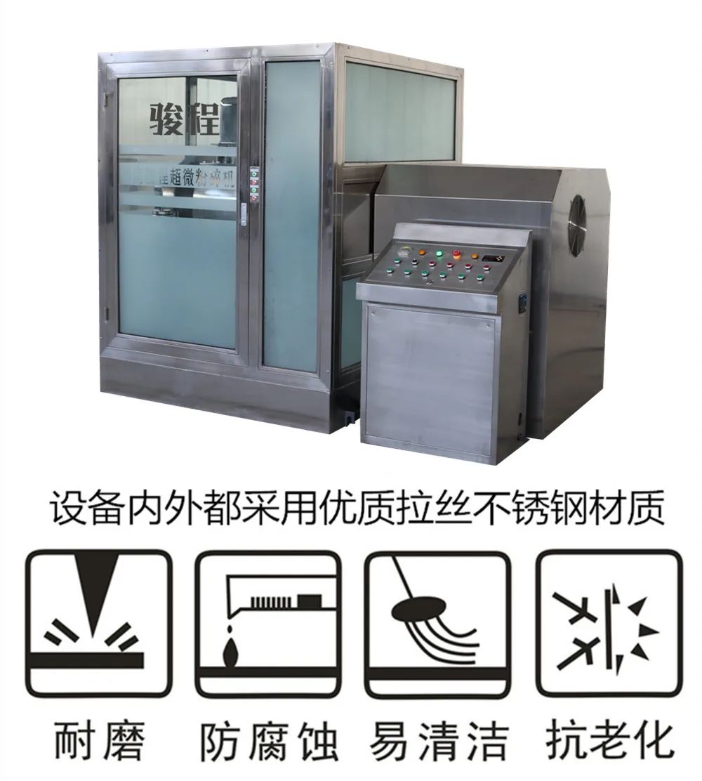 JCWF-130B低溫粉碎機利用高強度的振動,使物料在磨筒內受到高加速度撞擊、剪切、研磨,可在短時間內達到理想的粉碎效果。對于纖維狀、高韌性、高強度、遇熱發粘的物料都可以粉碎至細胞級微粉。全密閉作業,無粉塵污染、無物料損耗。